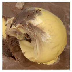 n umbrella of sun yellow Chiquita banana ice cream over deep dark dangerous chocolate ice cream with a winding river of chocolate fudge ripple